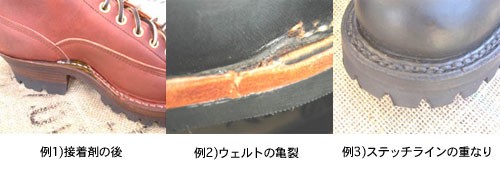 例2) 写真中:ステッチ穴までトリミングされ、ウェルトに亀裂が入っている。