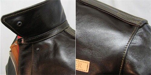 ■シルエット&着心地 使用される革は定番中の定番、アニリンハンドフィニッシュが施されたダークシールブラウン。やや細身の腕周りと腹部を中心に小さめな背中(バックパネル)を採用しスマートなシルエットを形成する。革厚1,3ミリは、重厚さを適度に残す往年の高品質レプリカA-2の象徴といえよう。